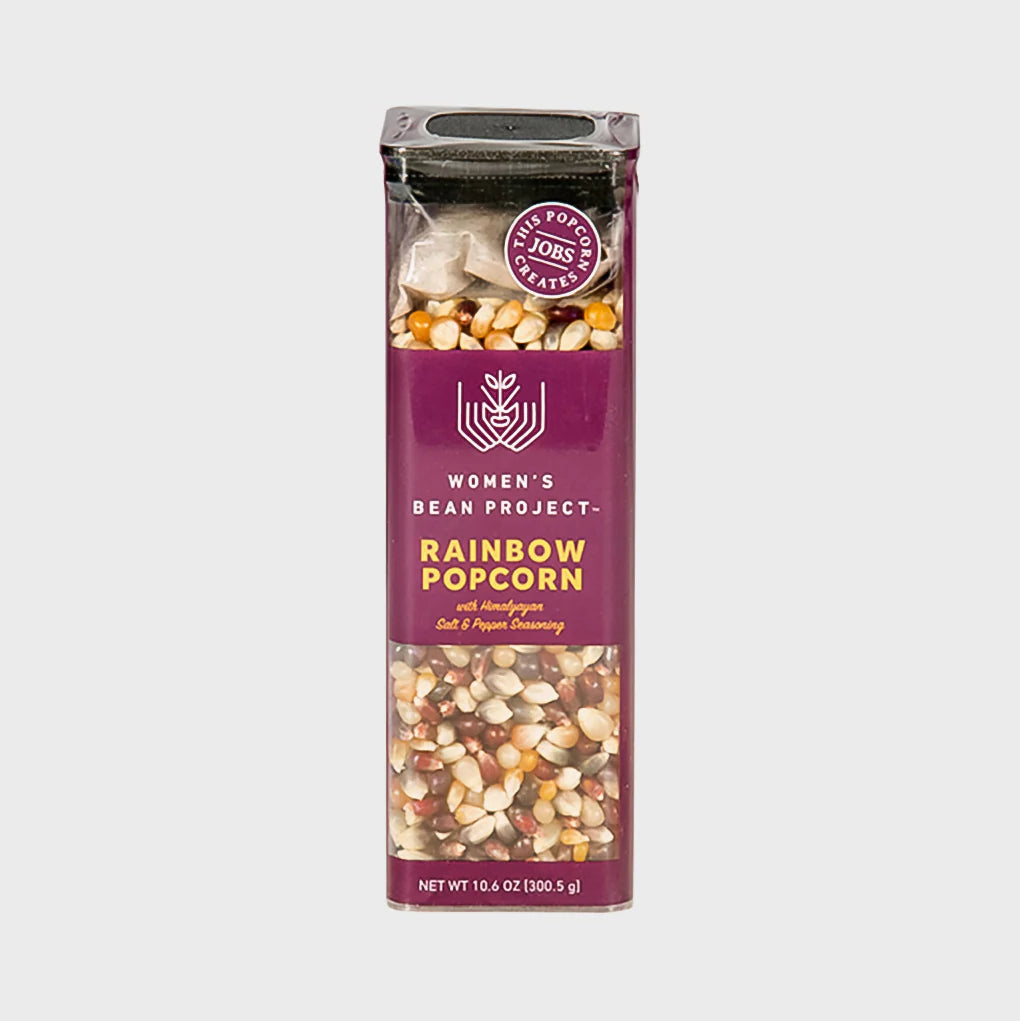 - Rainbow popcorn kernels with pink Himalayan salt and black pepper seasoning