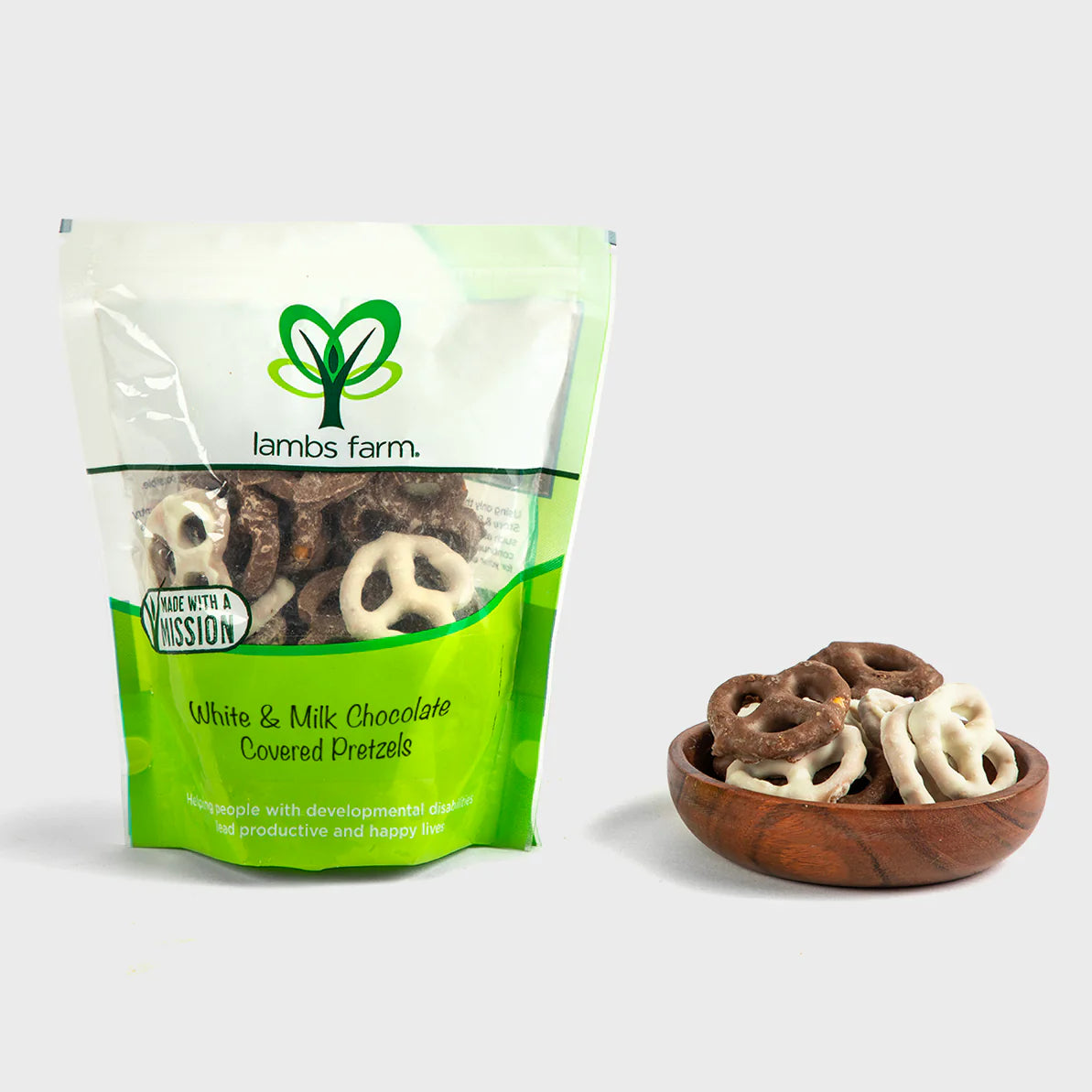 - Sweet and salty white and milk chocolate-covered pretzel twists, 5 oz